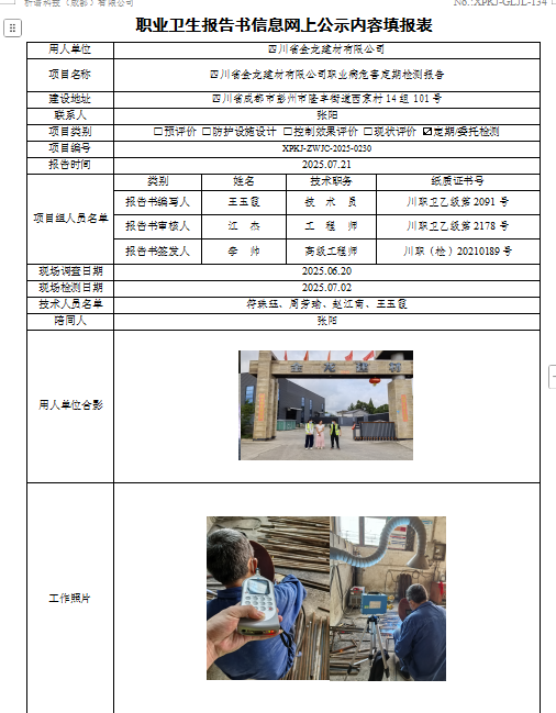 四川五洋工贸有限责任公司职业病危害因素定期检测