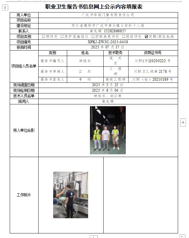 广汉市华莉门窗有限公司职业病危害因素定期检测