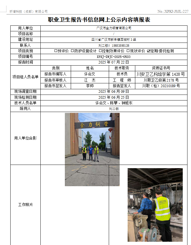 广汉市金力钢管有限公司职业病危害因素定期检测