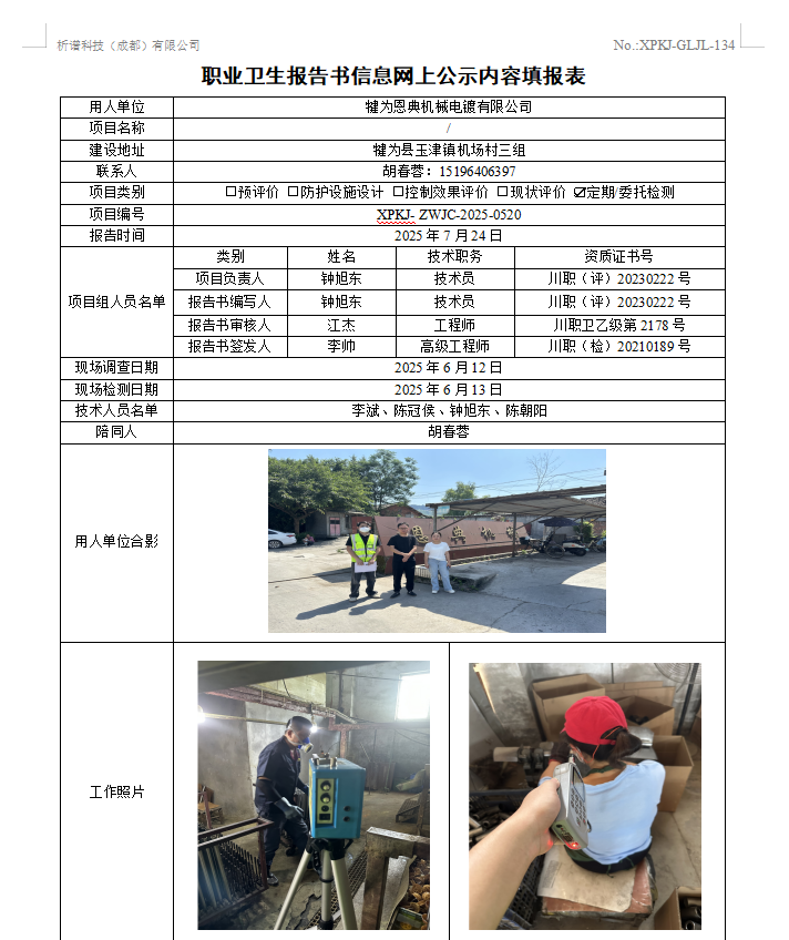 犍为恩典机械电镀有限公司职业病危害因素定期检测