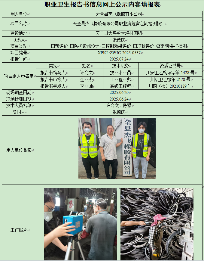 天全县杰飞橡胶有限公司职业病危害因素定期检测