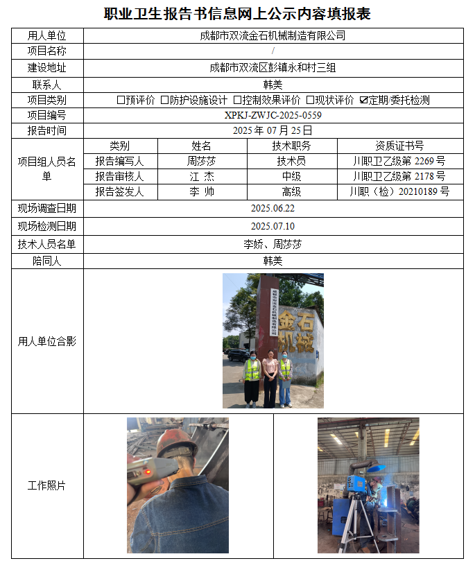 成都市双流金石机械制造有限公司职业病危害因素定期检测