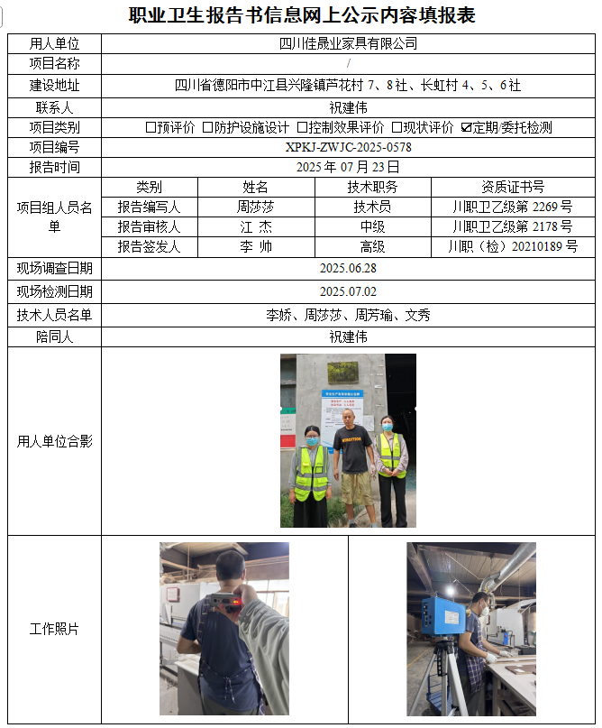 四川佳晟业家具有限公司职业病危害因素定期检测