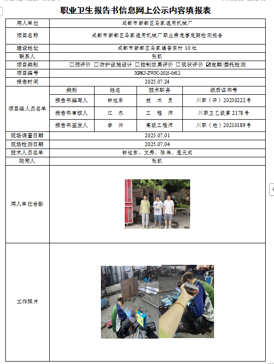 成都市新都区马家通用机械厂职业病危害因素定期检测