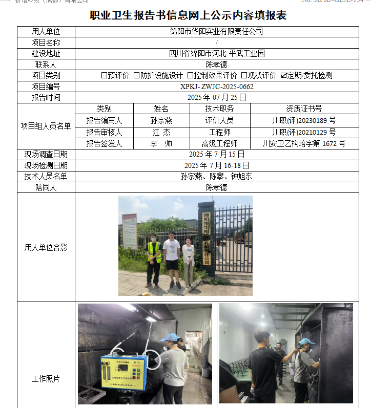 绵阳市华阳实业有限责任公司职业病危害因素定期检测