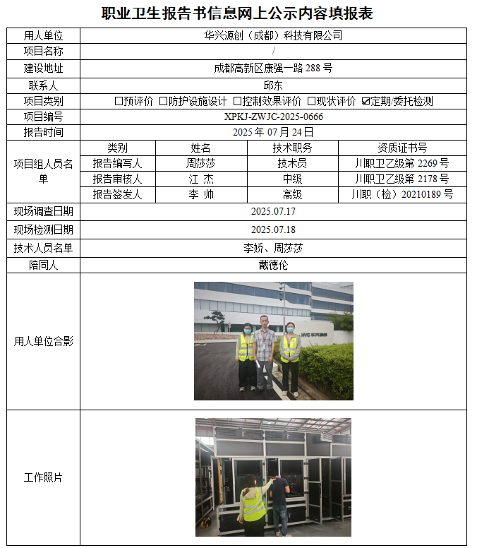 华兴源创(成都)科技有限公司职业病危害因素定期检测