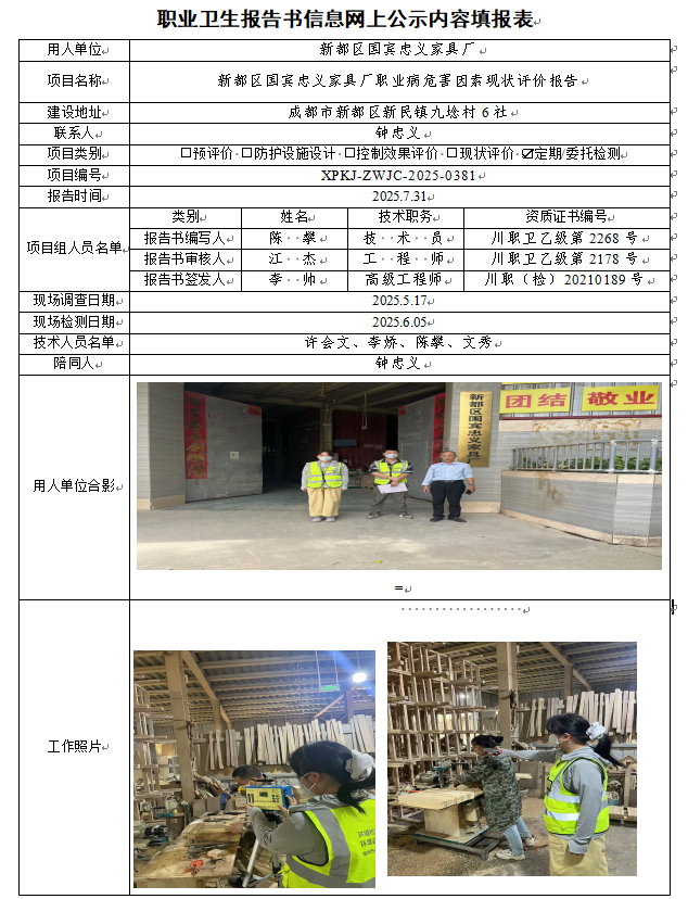 新都区国宾忠义家具厂职业病危害因素定期检测