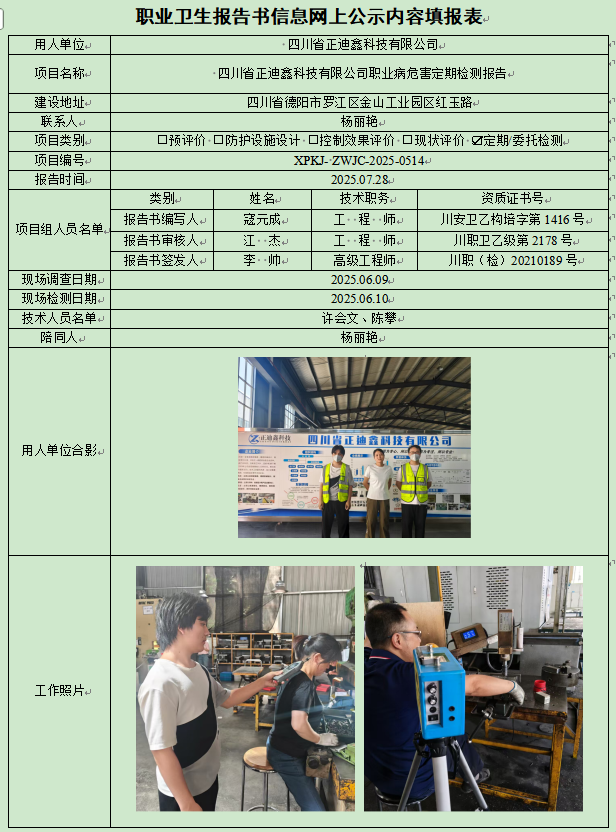 四川省正迪鑫科技有限公司职业病危害因素定期检测