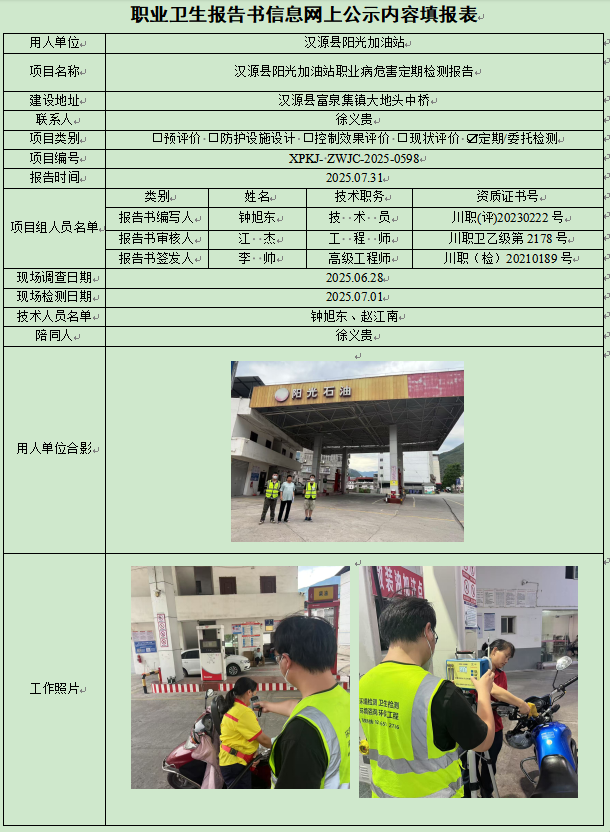 汉源县阳光加油站职业病危害因素定期检测