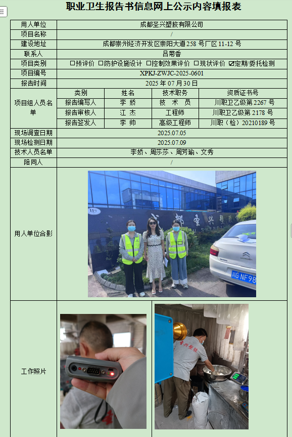 成都圣兴塑胶有限公司职业病危害因素定期检测