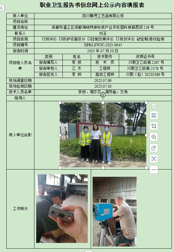 四川楠寻工艺品有限公司职业病危害因素定期检测