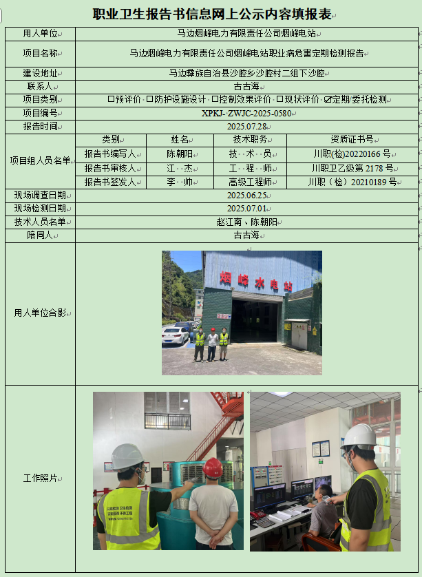 马边烟峰电力有限责任公司烟峰电站职业病危害因素定期检测