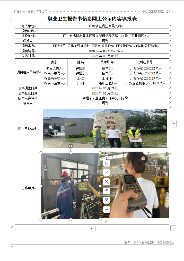 成都洪亚铝业有限公司职业病危害因素定期检测