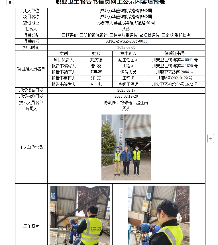 成都力华鑫智能装备有限公司职业病危害因素现状评价