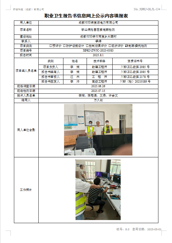 成都市邛崃宝源电力有限公司职业病危害因素定期检测