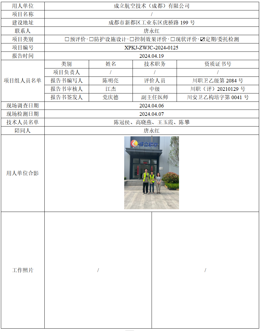成立航空技术(成都)有限公司职业病危害因素定期检测