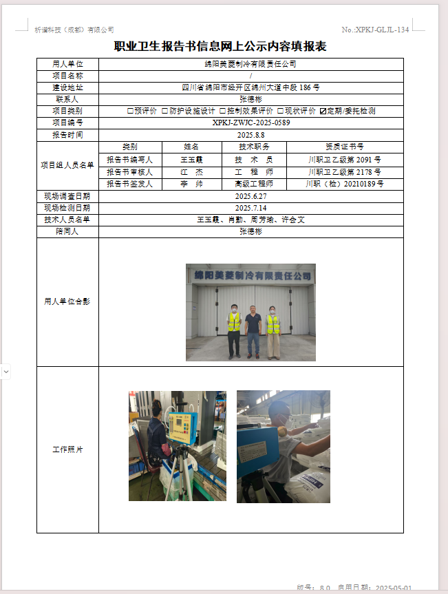 绵阳美菱制冷有限责任公司职业病危害因素定期检测