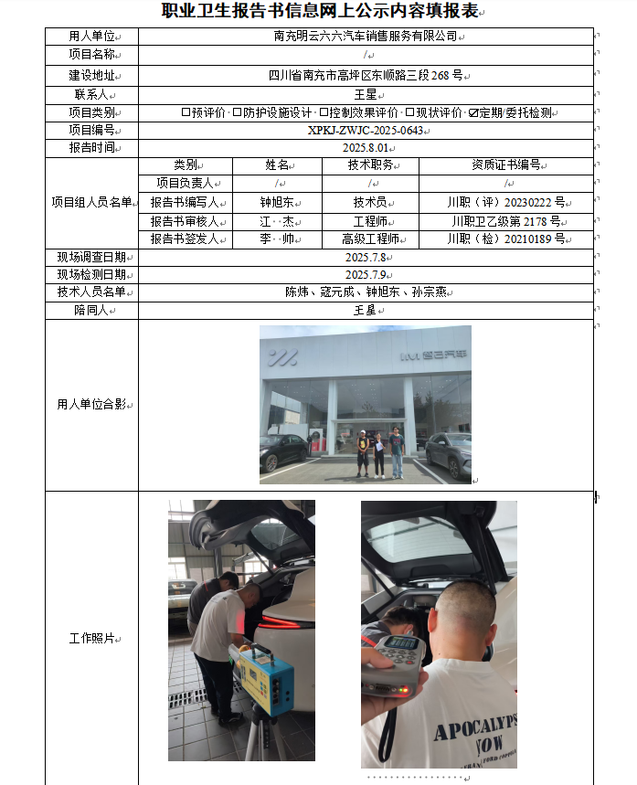 南充明云六六汽车销售服务有限公司职业病危害因素定期检测