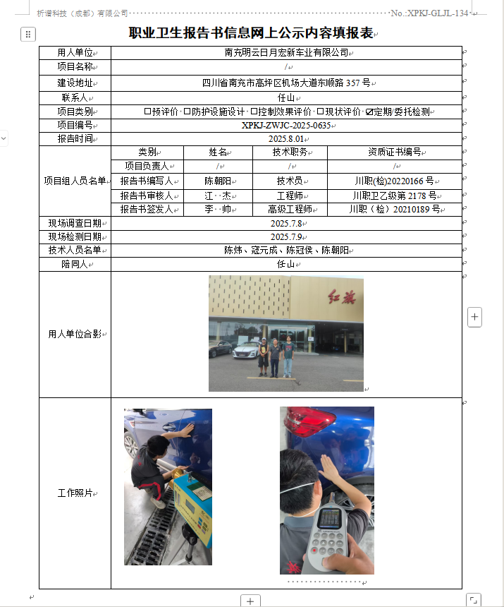 南充明云日月宏新车业有限公司职业病危害因素定期检测