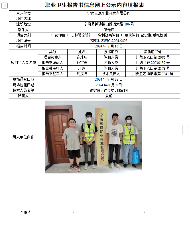 宁南三鑫矿业开发有限公司职业病危害因素定期检测