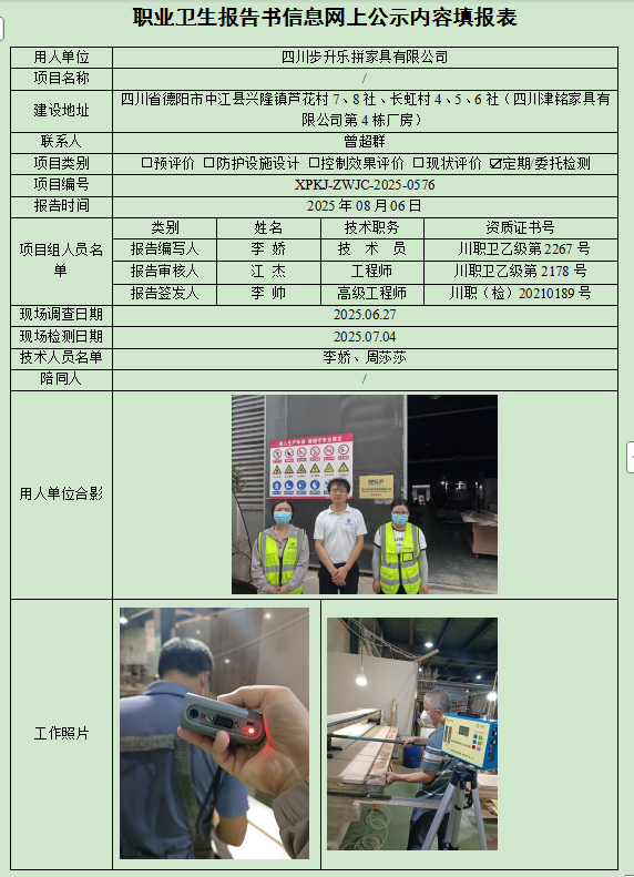 四川步升乐拼家具有限公司职业病危害因素定期检测