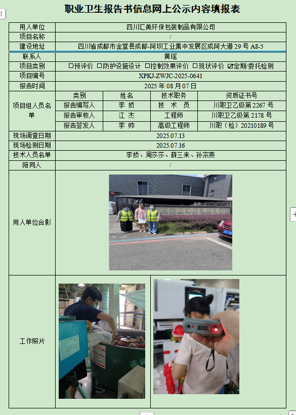 四川汇美环保包装制品有限公司职业病危害因素定期检测