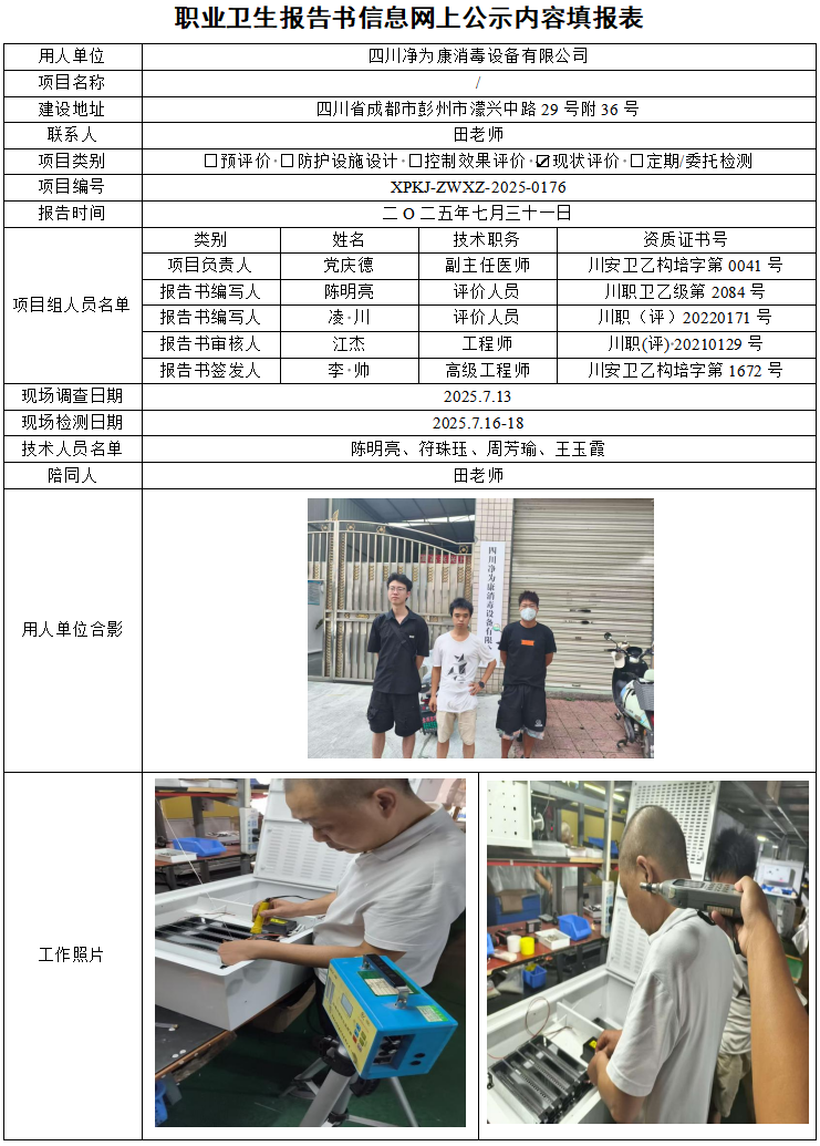四川净为康消毒设备有限公司职业病危害因素现状评价