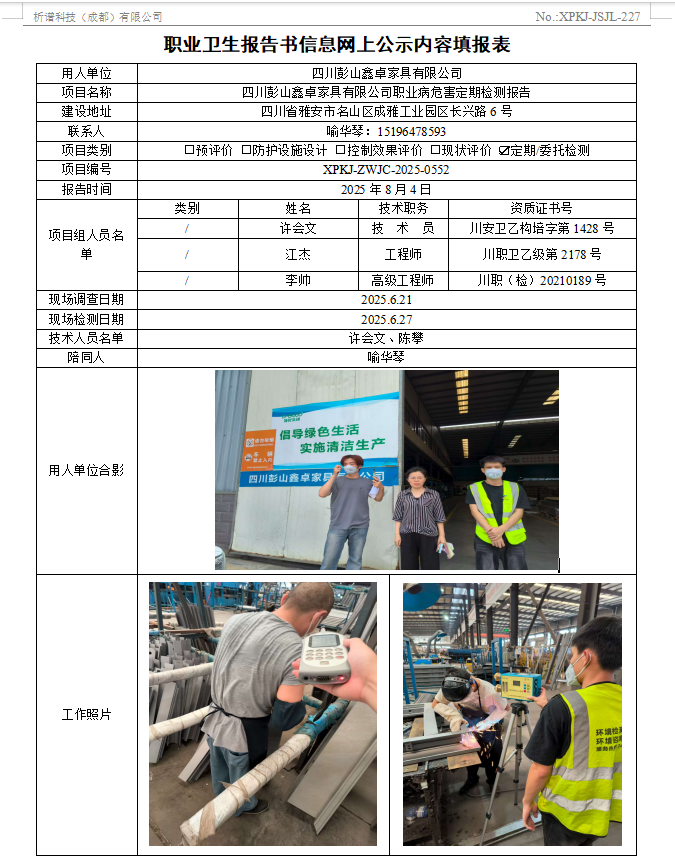 四川彭山鑫卓家具有限公司职业病危害因素定期检测