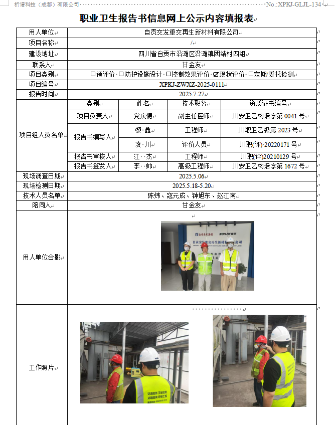 自贡交发重交再生新材料有限公司职业病危害因素现状评价