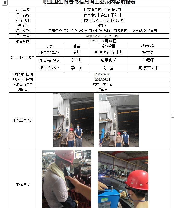 自贡市俊林实业有限公司职业病危害因素定期检测