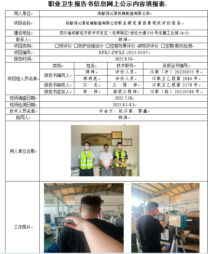 成都鸿沁源机械制造有限公司职业病危害因素现状评价