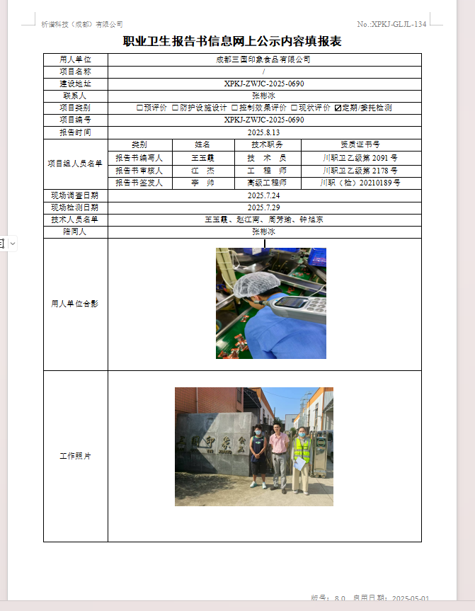 成都三国印象食品有限公司职业病危害因素定期检测
