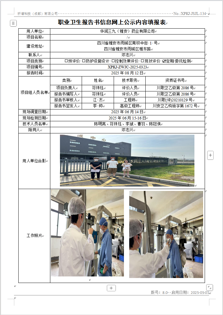 华润三九(雅安)药业有限公司职业病危害因素定期检测