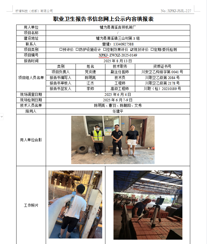犍为县清溪吉祥机砖厂职业病危害因素现状评价