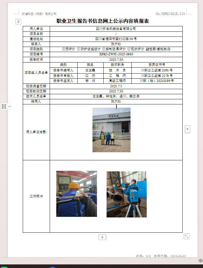 四川楠寻工艺品有限公司职业病危害因素定期检测