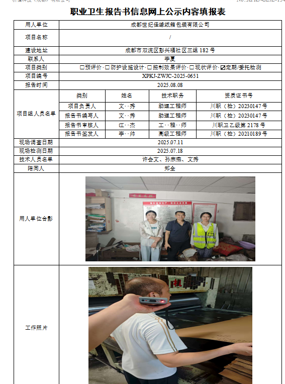 成都世纪佳缘纸箱包装有限公司职业病危害因素定期检测
