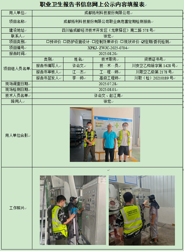 成都拓利科技股份有限公司职业病危害因素定期检测