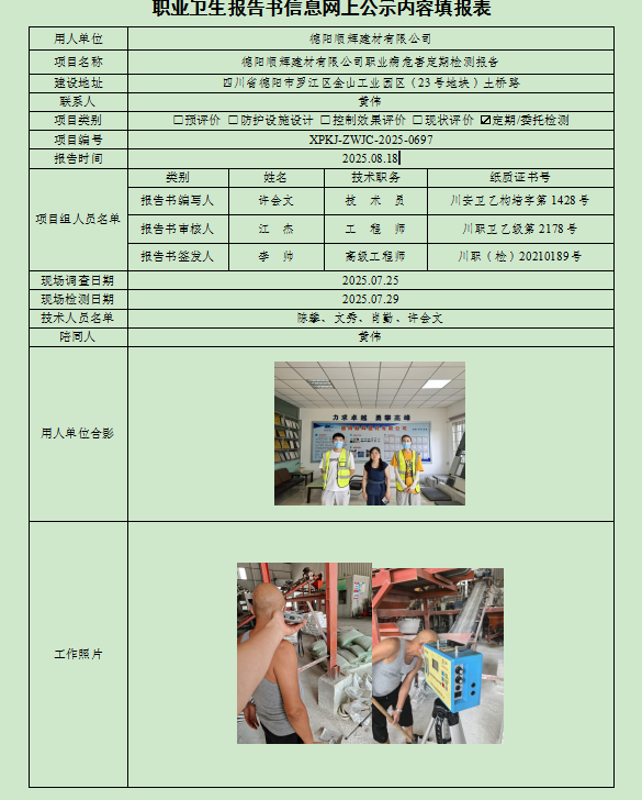 德阳顺辉建材有限公司职业病危害因素定期检测