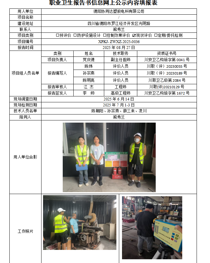 德阳协同达塑胶电料有限公司职业病危害因素现状评价