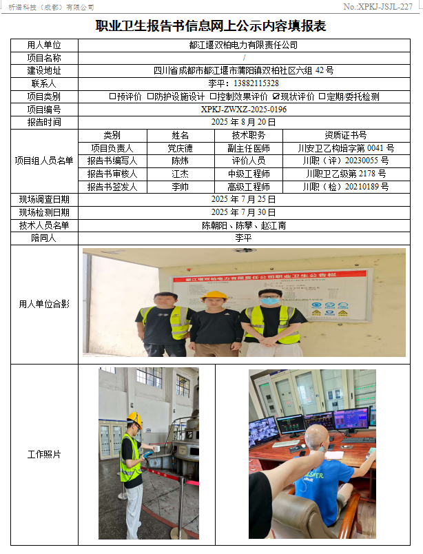 都江堰双柏电力有限责任公司职业病危害因素现状评价