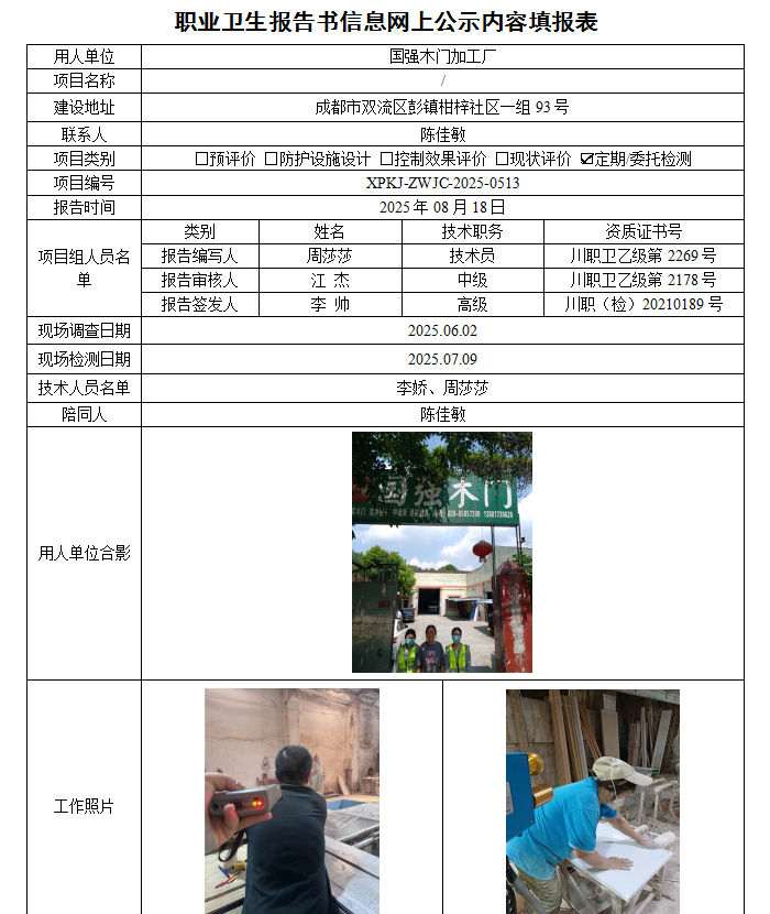 国强木门加工厂职业病危害因素定期检测