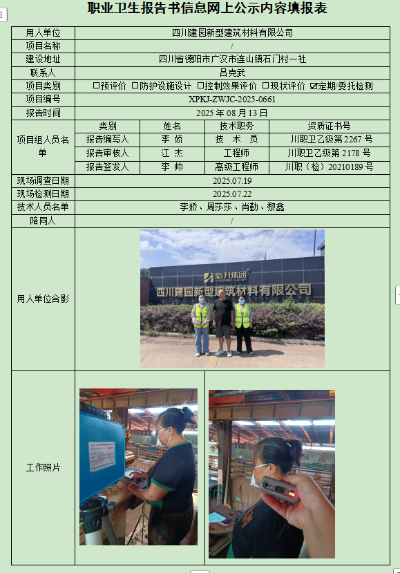 四川建园新型建材有限公司职业病危害因素定期检测