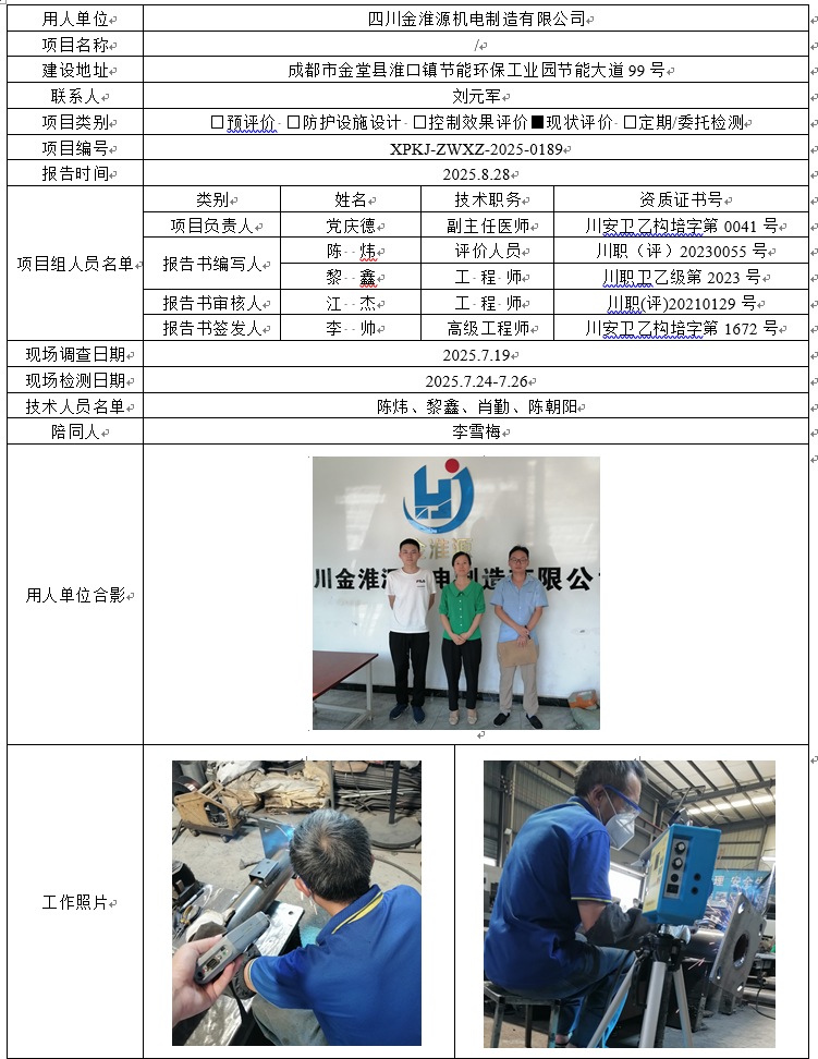 四川金淮源机电制造有限公司职业病危害因素现状评价