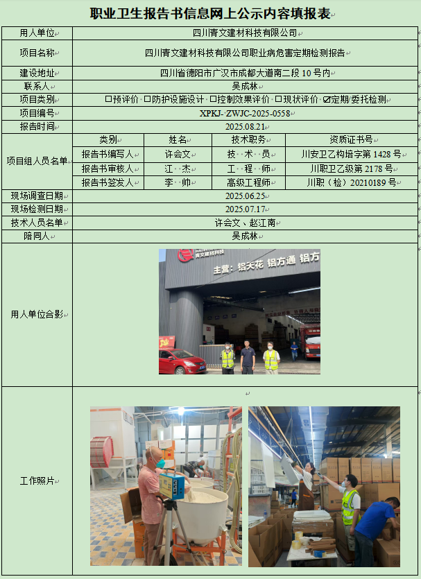 四川青文建材科技有限公司职业病危害因素定期检测
