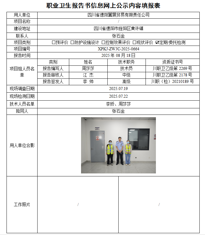 四川省德阳翼展贸易有限责任公司职业病危害因素定期检测