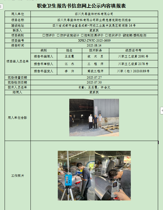 四川天粤装饰材料有限公司职业病危害因素定期检测