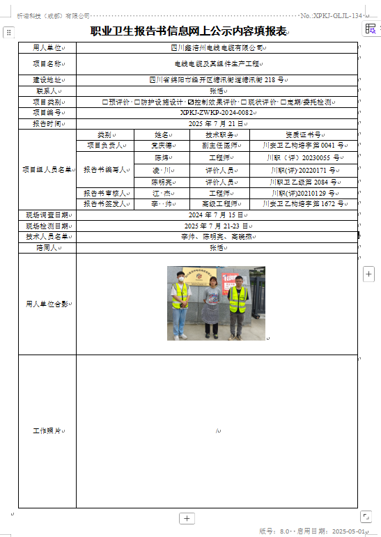 四川鑫涪州电线电缆有限公司职业病危害因素控制效果评价