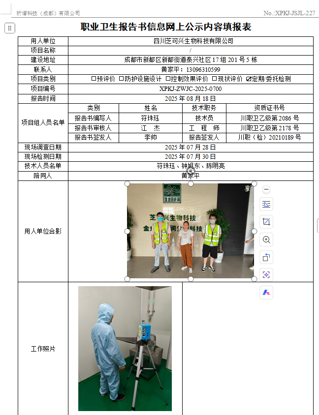 四川芝可兴生物科技有限公司职业病危害因素定期检测