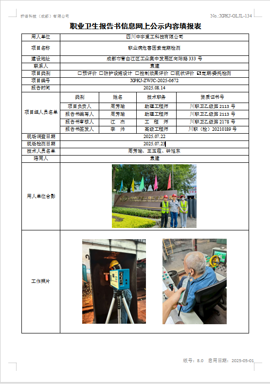 四川中宇重工科技有限公司职业病危害因素定期检测