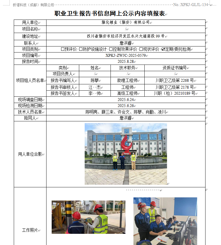 雅化锂业(雅安)有限公司职业病危害因素定期检测